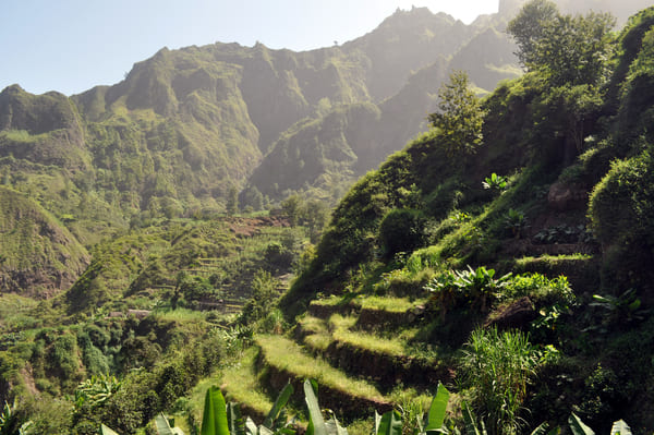 Vous empruntez ensuite la fameuse route pavée de la Corda, qui sillonne d’abord autour de l’impressionnant cratère de Cova, aujourd’hui vert et boisé, puis sur les crêtes et les flancs de montagnes des vallées les plus verdoyantes du Cap Vert. Vous découvrirez ainsi une multitude de paysages féériques. Arrivés dans les vallons de Figueiral et Cha de Pedras, vous pourrez faire une petite randonnée d’1h30 environ, pour vous perdre dans les terrasses cultivées et autres plantations de café.